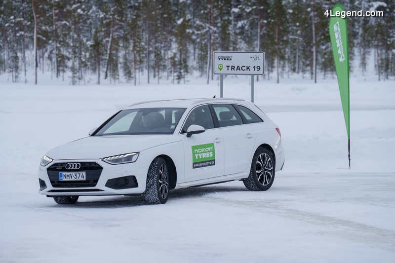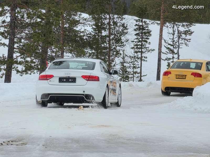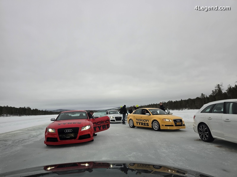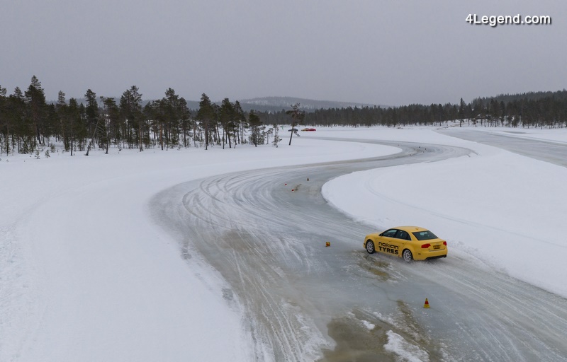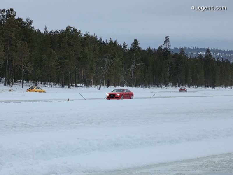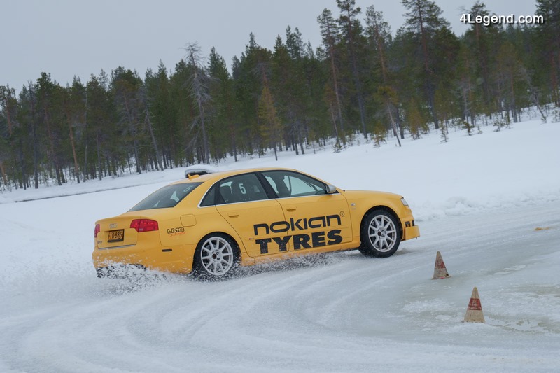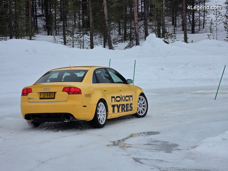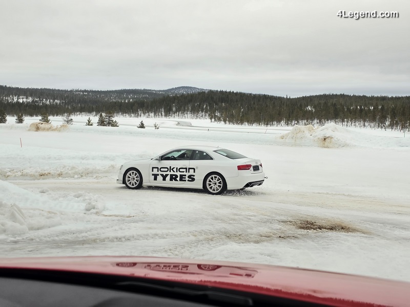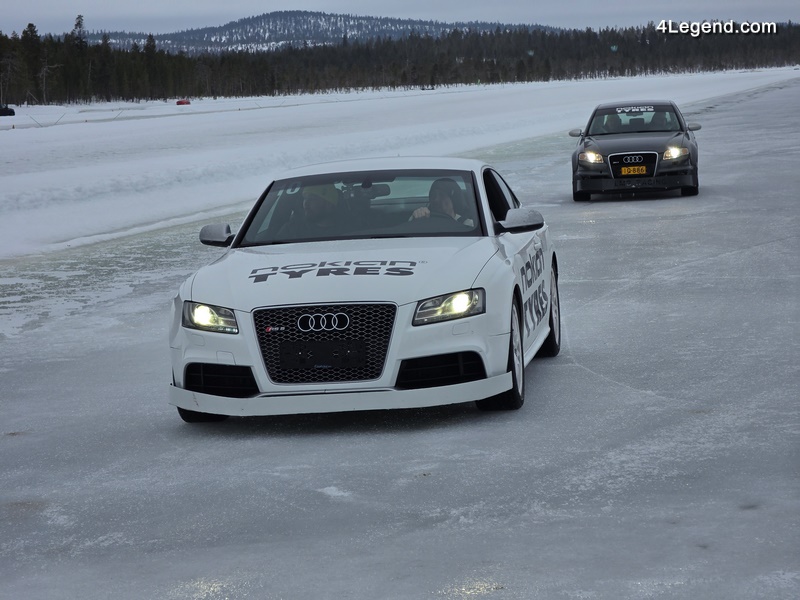 Après une présentation de ce pneu s’annonçant très prometteur, place aux essais sur un lac gelé avec 1 mètre d’épaisseur de glace. Les montures pour la conduite sur une piste de glace avec certaines parties recouvertes de neige et même d’eau étaient des Audi RS 4 berline et RS 5 Coupé (toutes en 4 roues motrices permanentes) chaussées de pneus Nokian Hakkapeliitta 01.