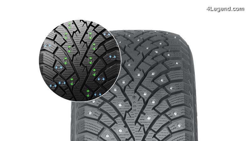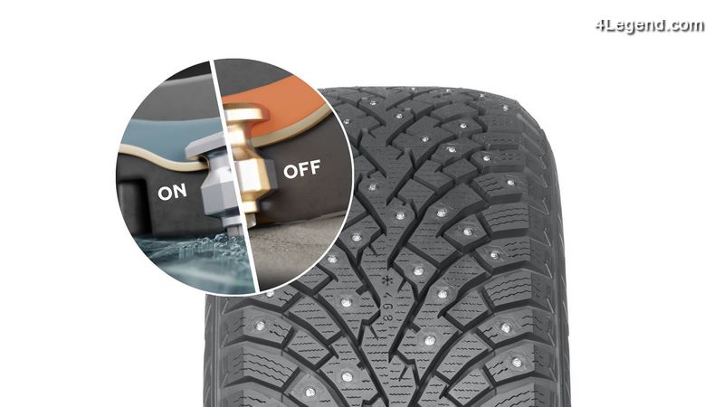 Grâce à une couche de base adaptative sur laquelle repose la partie inférieure du crampon. Lorsque la température est basse, les crampons sont poussés vers l’extérieur par la couche de base rigide et demeurent déployés pendant la conduite. Lorsque le temps se réchauffe, le composé se ramollit et exerce moins de force sur les crampons, ce qui leur permet de rentrer plus profondément dans le pneu.