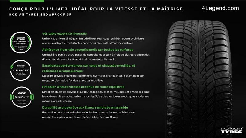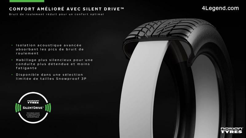 Nokian Tyres a développé le Nokian Tyres Snowproof 3P pour répondre aux exigences spécifiques des véhicules électriques. Le pneu est équipé de la technologie SilentDrive de Nokian Tyres, une couche de mousse acoustique fixée à la doublure intérieure du pneu qui atténue les niveaux de bruit aux fréquences les plus gênantes pour les conducteurs. Cela permet une conduite plus douce et plus confortable que les générations précédentes du produit.