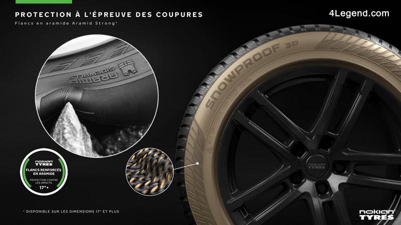 Le Nokian Tyres Snowproof 3P fait également un pas en avant en matière de durabilité. Nokian Tyres propose des flancs renforcés en aramide dans toutes les tailles de pneus de 17 pouces et plus, renforçant le pneu contre les impacts des nids-de-poule et des dangers de la route grâce au même matériau utilisé dans les industries de la défense et de l’aérospatiale. L’aramide est une fibre légère intégrée dans les flancs qui réduit le risque de crevaison. Par ailleurs, un large protecteur de jante protège les roues contre les dommages causés par les bordures de trottoir et les chocs.