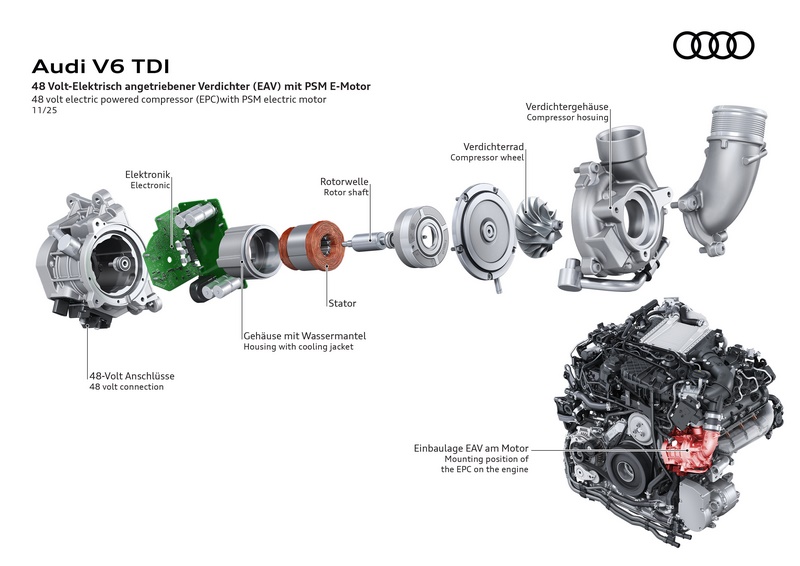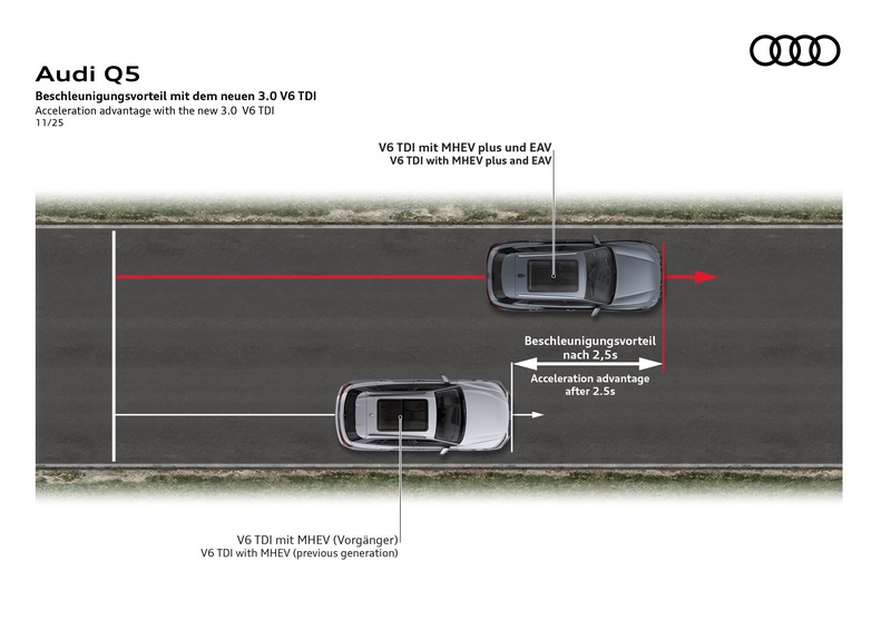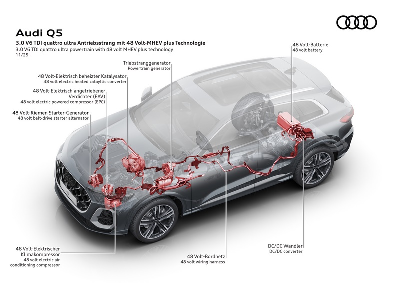 Pour la première fois sur l’Audi Q5, la motorisation V6 TDI est associée à un compresseur électrique nouvelle génération, intégré à la stratégie de gestion moteur. Ce dispositif assiste le turbocompresseur dans un système de suralimentation à deux étages. Il supprime presque totalement le temps de réponse et permet une montée en pression plus rapide : la pression maximale de suralimentation est atteinte près d’une seconde plus tôt grâce à l’interaction entre le compresseur et le générateur de chaîne cinématique. Le résultat se ressent immédiatement au volant : accélérations plus franches, réponse de pédale plus directe et disponibilité du couple dès les plus bas régimes.