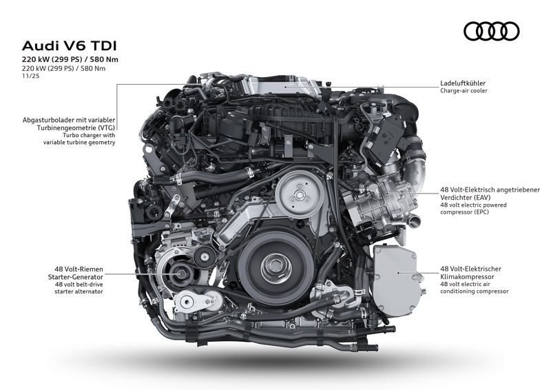 Parce qu’Audi poursuit le développement de solutions de mobilité plus responsables, ce nouveau V6 TDI est compatible avec le carburant durable HVO 100, conforme à la norme EN 15940. Ce carburant, produit à partir de résidus et de déchets organiques, permet de réduire les émissions de CO₂ de 70 à 95 % par rapport au diesel fossile. Les véhicules neufs sortant des usines Audi en Allemagne sont livrés avec du HVO déjà présent dans le réservoir, témoignant de l’engagement croissant de la marque en matière de décarbonation.