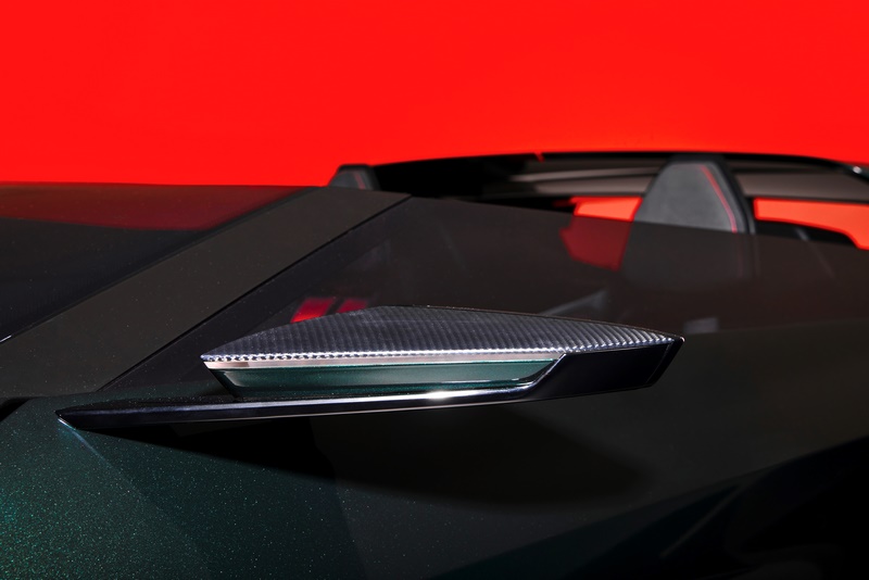 Les contours des portes sont particulièrement distinctifs, encadrés par les bas de caisse (ornés du badge « Gran Turismo » à l’arrière), le montant C et les passages de roue très évasés. Détail discret mais exclusif sur les flancs : le badge GTI illuminé, intégré à la ligne « tornado ». Sur la partie supérieure de la porte, la vitre latérale forme une ligne qui remonte vers l’avant avec le pare-brise profilé. Dans cette zone, le GTI Roadster évoque un hors-bord ; les rétroviseurs, avec leurs coques en carbone fixées sur les montants de porte, ressemblent à de petites ailes.
