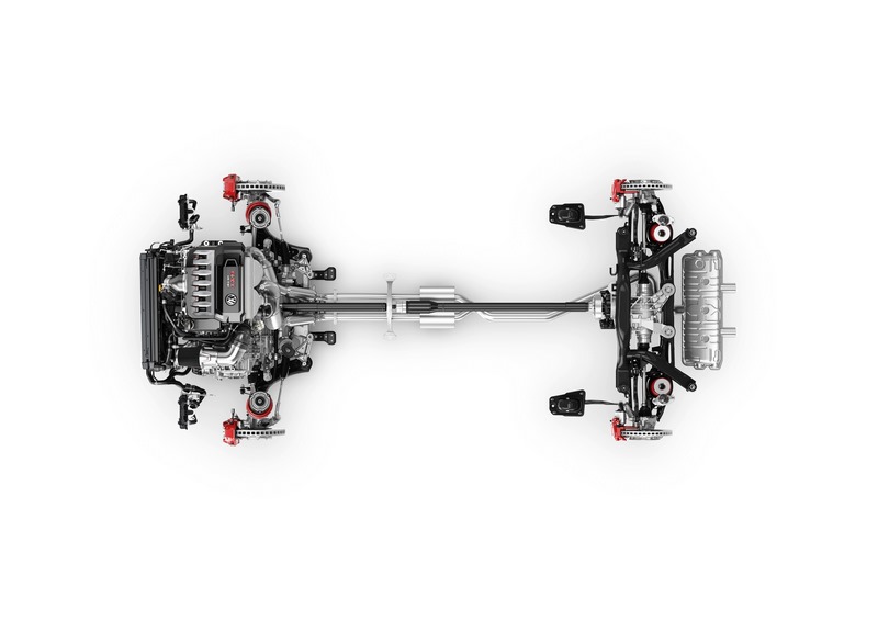 Les jantes alliage 20 pouces de la GTI arborent un nouveau design. Les designers ont intégré des éléments couleur carrosserie à ces jantes à fixation centrale ; ces éléments forment un cercle rouge lorsque les roues tournent. Les roues avant (8,5J x 20, ET32) sont chaussées de pneus 235/35 ZR20, tandis que les roues arrière (9,5J x 20, ET25) sont équipées de pneus 275/30 ZR20. Un examen attentif entre les rayons révèle la présence de disques de frein en céramique extrêmement robustes. À l’avant, les étriers de frein pincent des disques de 380 mm de diamètre ; à l’arrière, les disques mesurent 356 mm de diamètre.